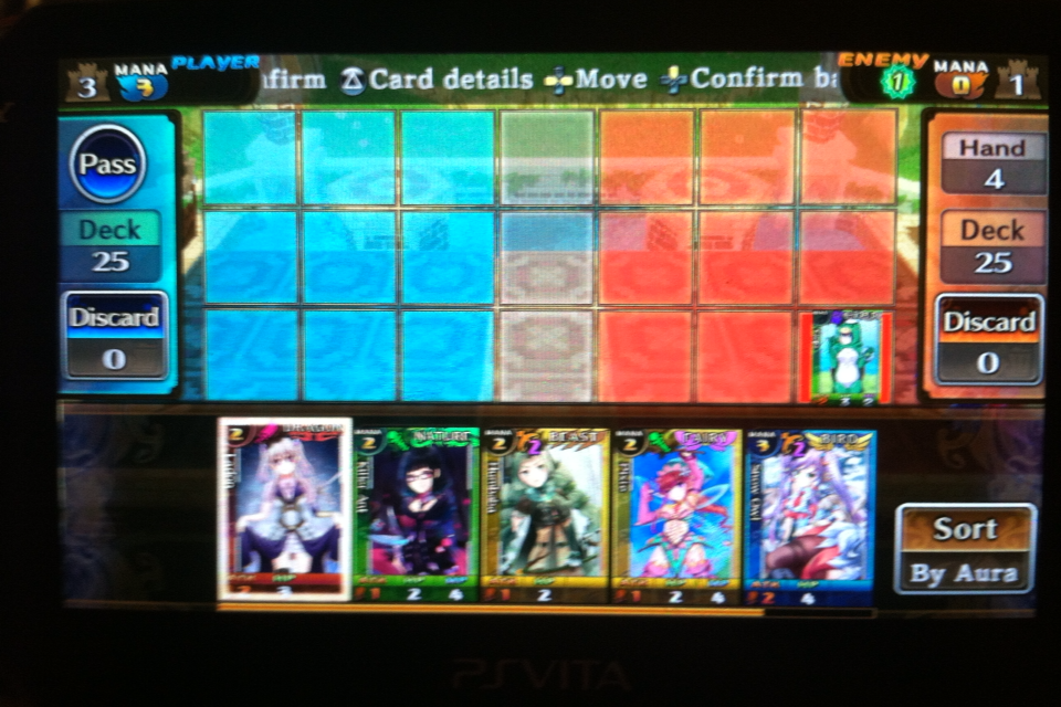 So your thinking ” Ok.. Card battles.. Like Magic the Gathering or Hearthstone?”… Well kinda.. You play this game on a grid and your objective is to get your character on the other side to attack your enemies Base/HQ/Castle. Each round you gain 3 Mana. From here on out it kinda does work like other card battle games. You look at your cards.. If you have the mana you can summon it. You pick where you want to place it on your blue spaces and then your turn ends. Only one card can be summoned at a turn.. So no building up mana and putting out 3 or 4 cards at once for you.