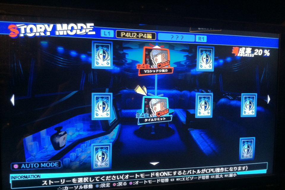 Here is your story menu… Nice looking.. Clean.. Reminds me alot of another game that I wont mention even though they worked together… But yep.. Now I know what you might be thinking… ” What is that ???”… It is for extra story mode. Now you know! Yes the story is in Japaneses.. So I hardly have any clue on what is going on.. I will have to be just like you, wait until the North American release to understand what the hell is going on. Also if you do not like fighters but you love Persona.. They have you covered by using Auto Mode.. Sit back and enjoy the story while the CPU will fight for you.